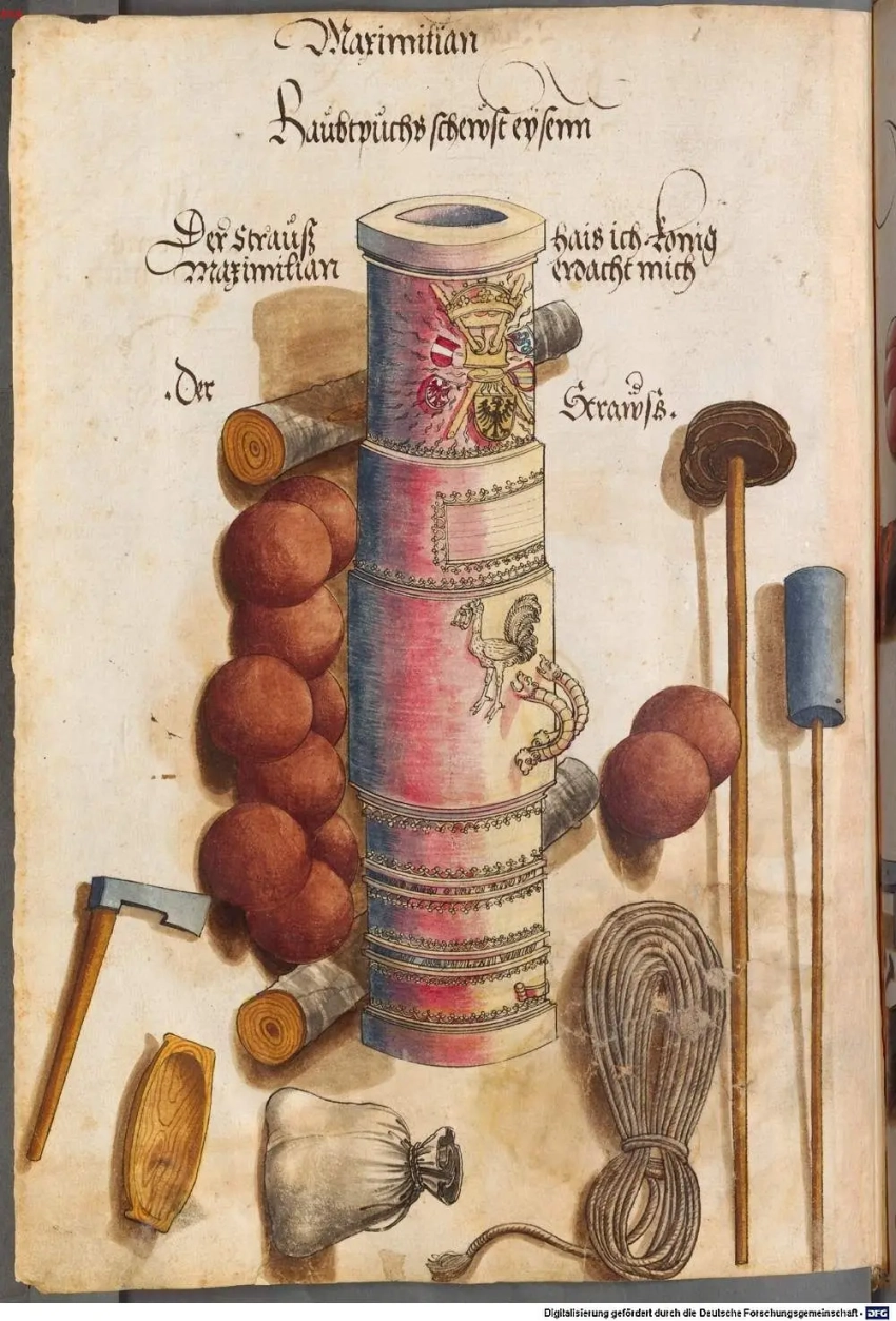 Однако как раз в области военного дела, оружия и боеприпасов конца XV – самого начала XVI века есть прекрасно иллюстрированный манускрипт, составленный Бартоломеусом Фрейслебеном (специалистом по вооружению) на службе у императора Священной Римской империи Максимилиана I (1459–1519 гг.). Этот манускрипт получил название «Книги вооружения», и вот как раз в нем имеется множество прекрасных цветных иллюстраций. Дело в том, что Максимилиан I стремился укрепить свою армию и потому приказал Бартоломеусу составить опись всего, что содержалось в его арсеналах, чтобы иметь точное представление о своей военной мощи.