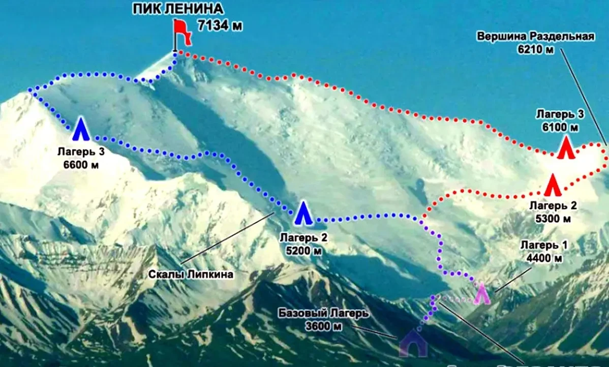 Имена альпинистов-первопроходцев: В. Глухов (руководитель), А. Овчинников (тренер), Г. Курочкин, Э. Мысловский, В. Сахаров, Г. Сергевнин, В. Иванов, Л. Добровольский, Ю. Зыков, Е. Кусов, Ю. Скурлатов, В. Сулоев и А. Шиндяйкин.