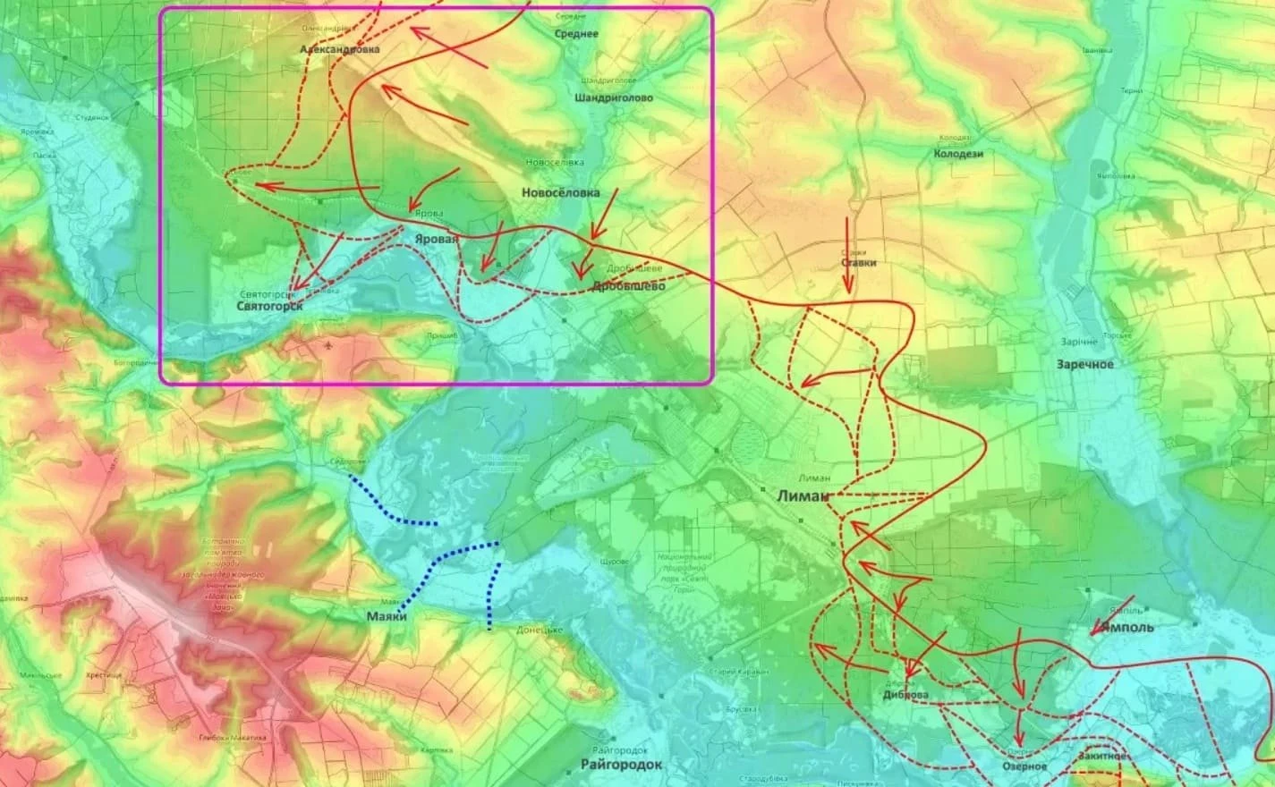 Ранее ряд военных источников сообщал о продвижении российских подразделений в районе Святогорска примерно на 10 километров и начале формирования охвата города. Однако, как следует из комментария Подоляки, на текущий момент речь идёт о тяжёлых боях без завершённого оперативного окружения.