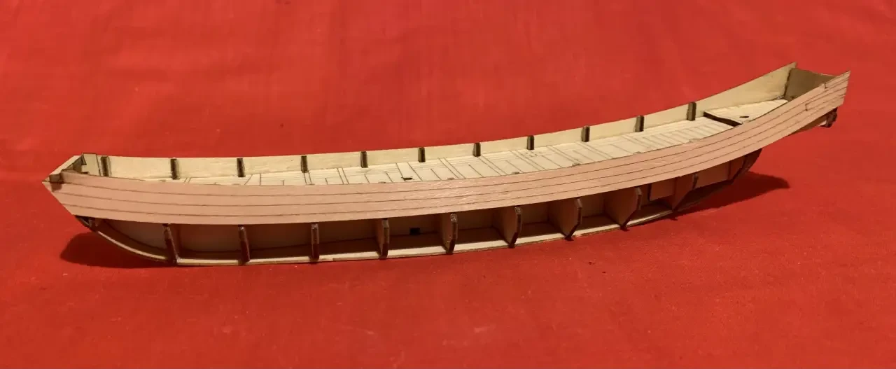 Собранный корпус китайской джонки без нижнего пояса обшивки, поэтому все шпангоуты и киль еще видны. Набор из Китая. Фотография автора