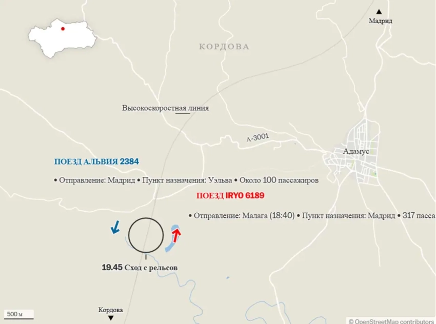 Речь идёт о схождении с рельсов пассажирского поезда Iriyo Малага-Мадрид, в котором было более 300 пассажиров. Вагоны поезда, по последним данным, при схождении врезались в другой поезд (Alvia), который двигался на скорости около 200 км/ч в противоположном направлении (Мадрид-Уэльва) по соседнему пути, и в результате столкновения составы сорвались с 4-метровой насыпи, доступ к которой затруднён. В скоростном поезде Alvia было около сотни пассажиров.