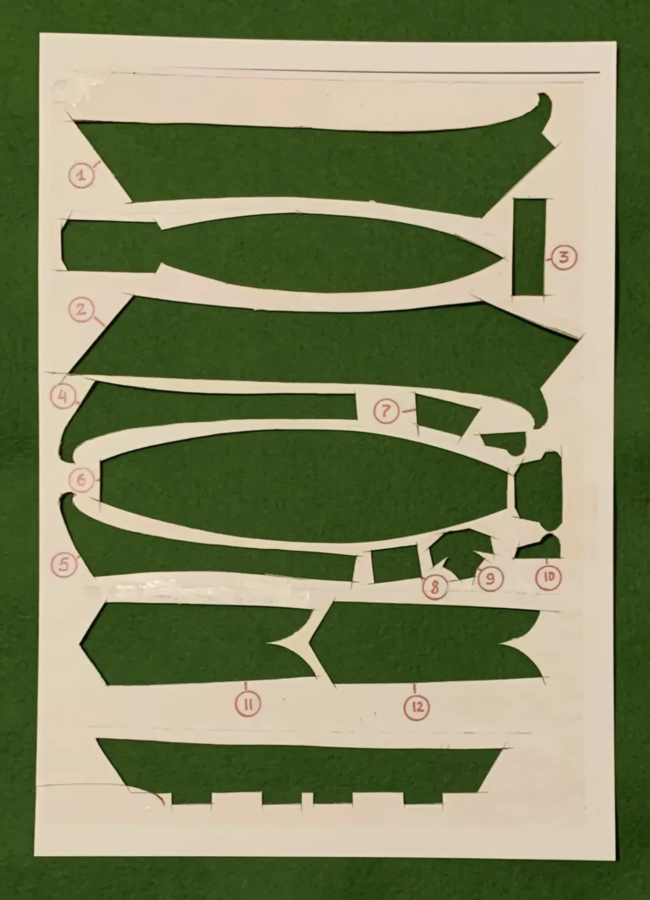 Только посмотрите на эту фотографию, где показан лист с деталями джонки, под которой специально подложена зеленая ткань, чтобы было видно, насколько же все они чисто вырезаны. От работы с таким гаджетом у детей явно руки окрепнут, разовьется глазомер, а также чувство цели и пространства, да и работать им он сможет очень быстро и аккуратно, практически не оставляя мусора