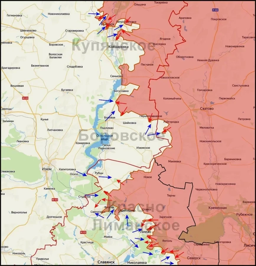 На Краснолиманском фронте ВС РФ закрепились на юго-востоке Красного Лимана и продвигаются на северо-запад, чтобы установить контроль над дорогой на Славянск. Улучшили позиции в лесах на севере и востоке Дробышево. Выше по фронту наши штурмуют Святогорск, дожимают противника в Александровке, наступаю на Коровий Яр.