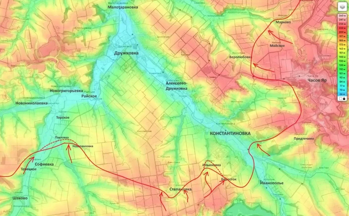 По словам Подоляки, российские бойцы заходят в Константиновку с юго-запада, а также ведут бои на юго-востоке города, куда они прорвались ранее. Блогер отметил, что подразделения РФ удерживают инициативу в ходе боевых действий в Константиновке.