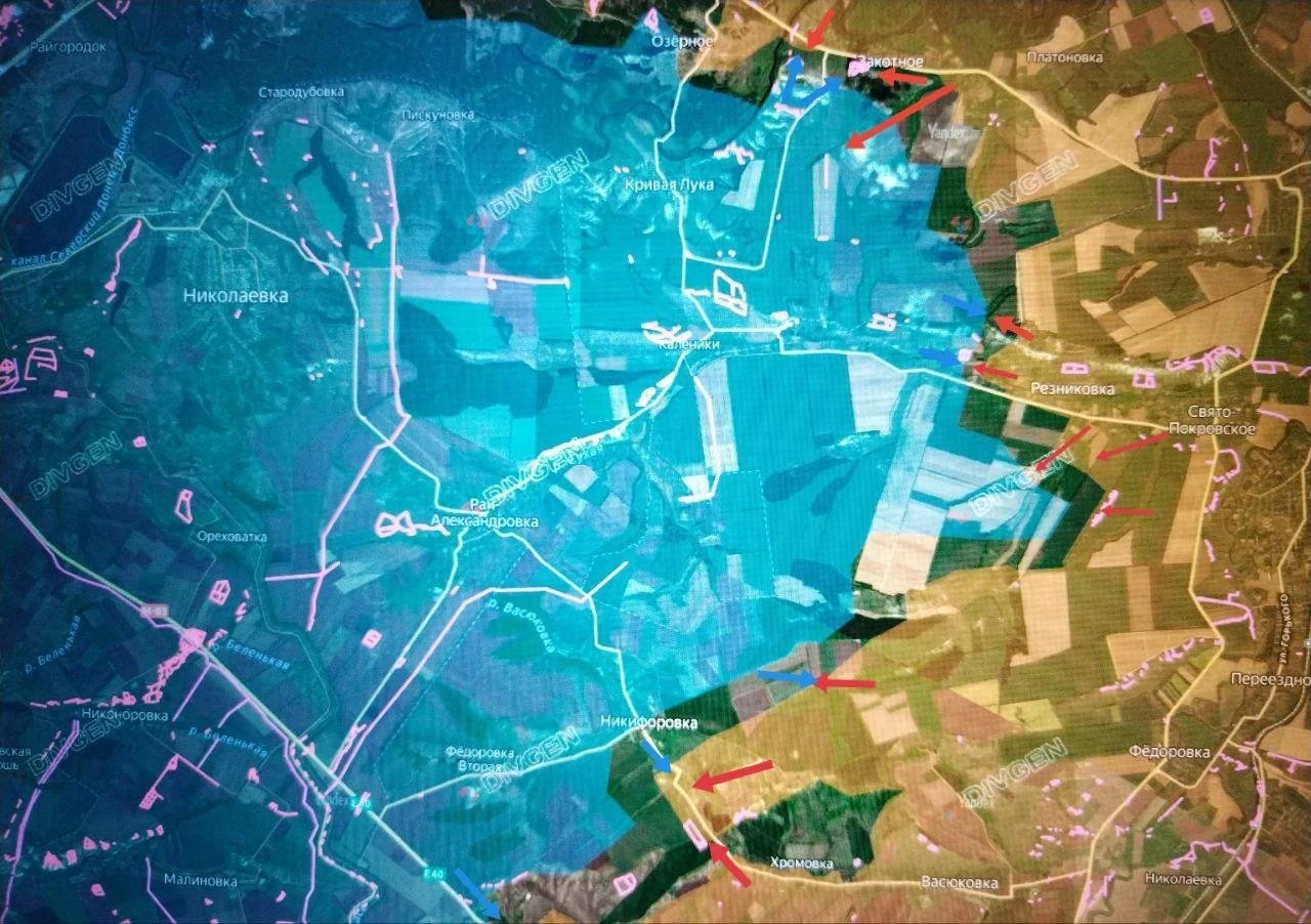 Группировка «Юг» ведёт успешные бои за высоты в районе Закотного - Кривой Луки - Резниковки. Также ВС РФ продвинулись в самой Резниковке и заняли позиции противника, с которых враг пытался контратаковать наших бойцов в этом посёлке и Кирово (оно же Свято-Покровское). Соответствующие данные обнародовал военкор Юрий Котенок в своём Telegram-канале.