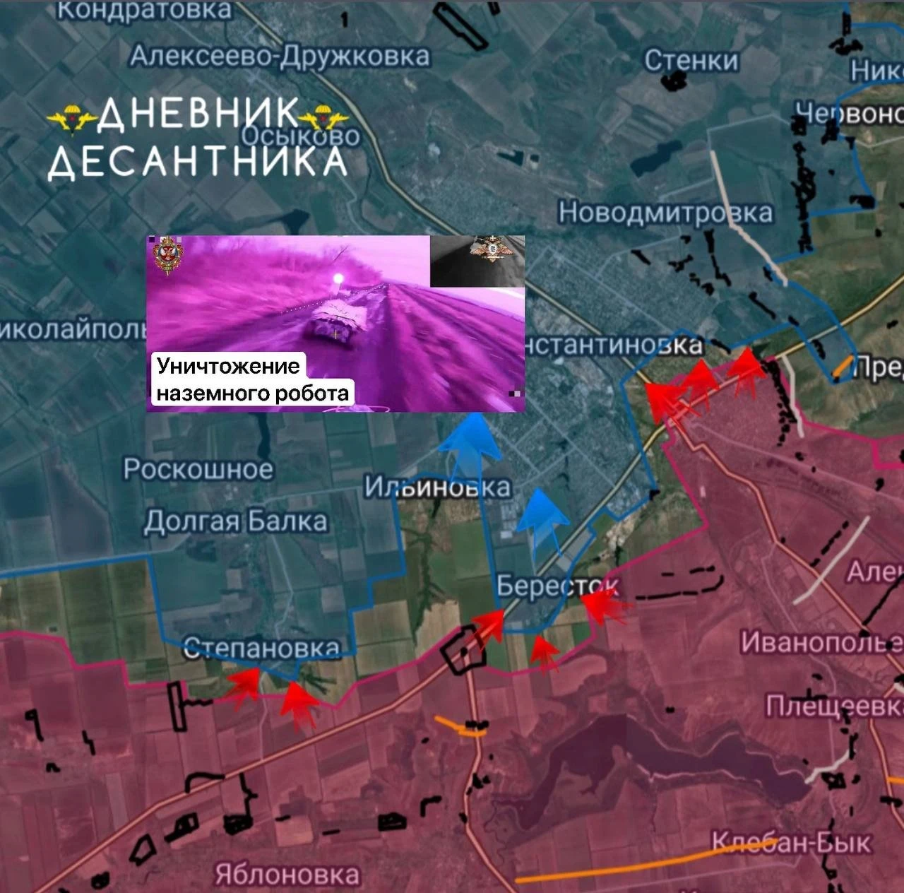 Кроме того, в районе Клебан-Быкского водохранилища также есть хорошие новости. Здесь ВС РФ взяли под контроль лесные массивы и продвинулись к селу Бересток. Наши бойцы окружают противника внутри села и ведут штурмы с трёх сторон: с запада, с водохранилища и с Иванполья. Бои идут не только в самом Берестке, но и на подступах к нему.