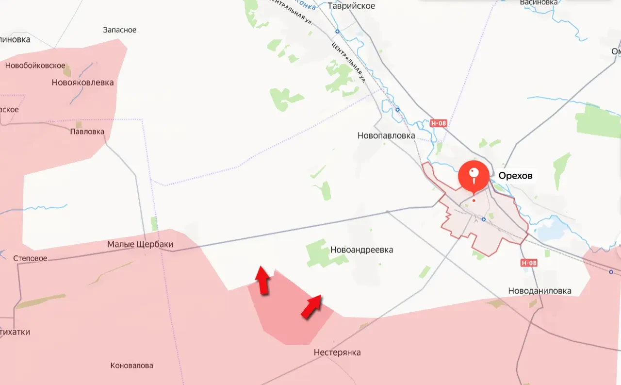 Напомним, что северо-западнее Орехова российские штурмовые группы подошли к населённому пункту Запасное, что в 8 км от автомобильной дороги Орехов-Запорожье. Такое расстояние позволяет создать значительные проблемы для противника, использующего эту дорогу (Н-08) для снабжения Ореховского гарнизона.