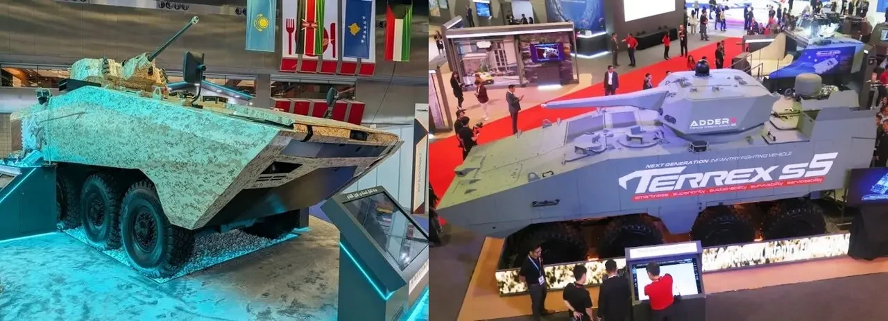 Однако Казахстан закупит плавающую БМП не на новой базе Terrex s5, а на платформе Terrex 2 – предыдущего поколения, но с учётом новых наработок. Этот корпус имеет меньшую массу (около 20-25 т), выдерживает попадание бронебойной пули от патрона 7,62х51 мм и подрыв 8 кг ВВ, не имеет гидропневматической подвески. На местном заводе компании Kazakhstan Paramount Engineering уже прошли модернизацию 200 бронемашин Terrex (вероятно, в интересах армии Сингапура, на вооружении которого состоит 435 единиц более ранних моделей).