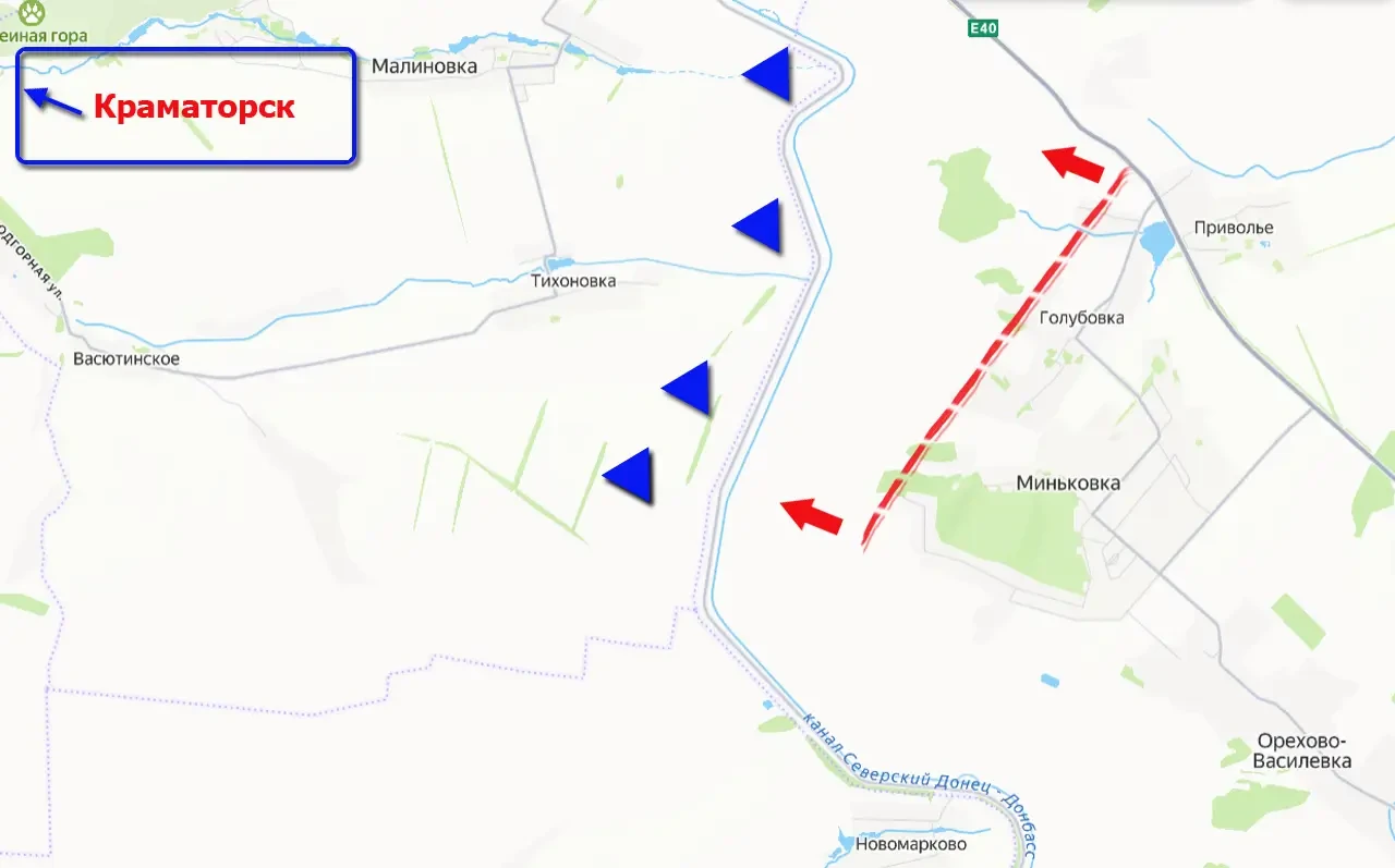 Противник пытается использовать канал на этом участке фронта как естественную преграду, понимая, что после его форсирования ВС РФ могут за считанные дни прорваться в Краматорск. Однако для противника в этом плане есть значительные минусы. Во-первых, ВС РФ уже перешли на западный берег канала чуть южнее - у Новомарково, во-вторых, сам канал сейчас сложно назвать полноценной водной преградой как минимум из-за сделавших своё дело морозов. Мало того, выстраивать свою оборону у канала ВСУ приходится под огнём со стороны российских Вооружённых сил.