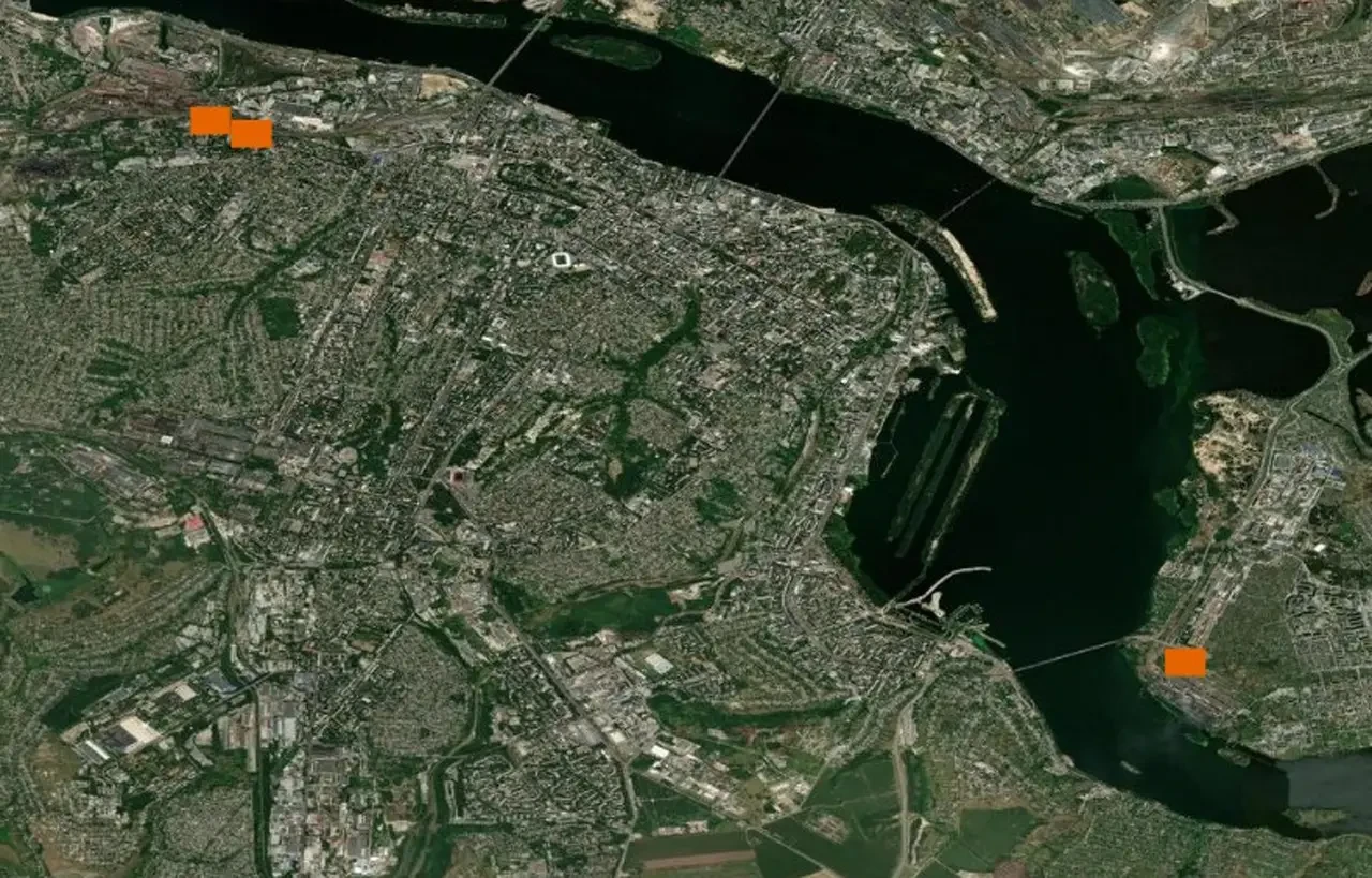 Спутники NASA отображают два очага пожара в Днепропетровске (переименован киевским режимом в Днепр). Метки соответствуют объектам железнодорожной инфраструктуры, которая противником активно используется в военных целях, а также промбазе, расположенной в восточной части города.