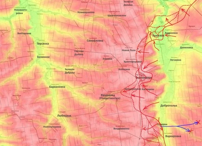 Западнее Гуляйполя особых изменений нет: там продолжаются упорные бои на линии Железнодорожное - Староукраинка - Цветочное. Однако Подоляка обратил внимание на события, развивающиеся в районе Терноватого. Там наши бойцы не только заняли Придорожное, но и вышли на окраины Рождественского - бои идут в восточной части населённого пункта.