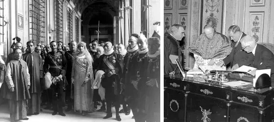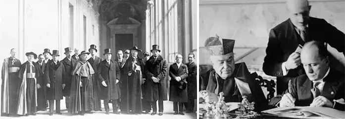На фото слева: представитель римского папы Пия XI кардинал Гаспари и премьер итальянского правительства Бенито Муссолини позируют в центре группы видных деятелей Святого престола и Италии в Латеранском дворце перед подписанием договора. Источник: Bettmann. На фото справа: кардинал-государственный секретарь Пьетро Гаспарри и Муссолини подписывают Латеранские соглашения, которые положили конец спорам по ожесточенному «Римскому вопросу», касавшемуся светской власти и независимости папства в контексте объединения Италии. Источник: Getty Images