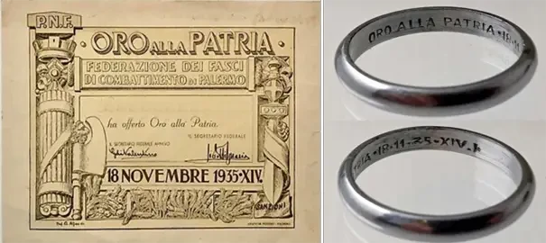 18 декабря 1935 года состоялось мероприятие, известное как «День обручального кольца», в ходе которого тысячи итальянцев спонтанно пожертвовали государству свои обручальные кольца и другие ценные вещи, скандируя при этом - «Золото Родине!». Это событие, прошедшее в крупных городах Италии, стало одним из главных символов национализма, характерного для двадцатилетнего фашистского периода. Источник: Getty Images