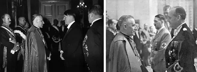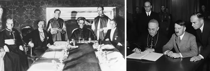 На фото справа: подписание Рейхсконкордата 20 июля 1933 года в Риме. Слева направо: прелат Людвиг Каас, вице-канцлер Франц фон Папен, секретарь по церковным делам Джузеппе Пиццардо, кардинал-государственный секретарь Эудженио Пачелли, Альфредо Оттавиани и член Рейхсминистерства внутренних дел Рудольф Буттман. На фото слева: А. Гитлер и нунций Ватикана Чезаре Орсенито (январь, 1935 год)