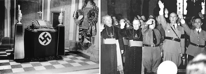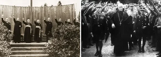 На фото слева: церковная кафедра Церкви Рейха. На фото справа: католические священнослужители выполняют нацистское приветствие рядом с лидерами НСДАП, включая Йозефа Геббельса (крайний справа). Источник: Bildagentur