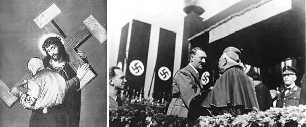 На фото слева: На «Конгрессе партии Рейха за единство и силу» 1934 года в Нюрнберге Адольф Гитлер приветствует протестантского епископа Рейха Людвига Мюллера (справа) и католического аббата Альбануса Шахляйтнера (в центре) в качестве почетных гостей. Фото: Генрих Хоффман. Источник: Bildagentur. На фото справа: Йозеф Геббельс и католический священник. Источник: Getty Images