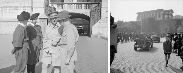 На фото слева: премьер-министр Новой Зеландии Питер Фрейзер и командующий 2-й новозеландской дивизией генерал Бернард Фрейберг разговаривают со швейцарскими гвардейцами у ворот Ватикана 4 июня 1944. Источник: George Bull. На фото справа: американские войска на площади Рима. 1944 год