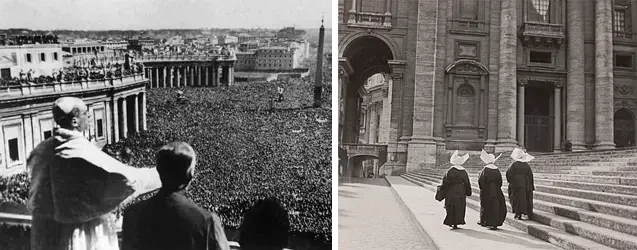 Папское государство до подписания Латеранских соглашений (1870-1929). Фото слева: въезд на закрытую территорию. Фото: Abeniacar/Getty Images. Фото справа: редкое фото Пия IX с некоторыми его прелатами. Источник: Rai Cultura
