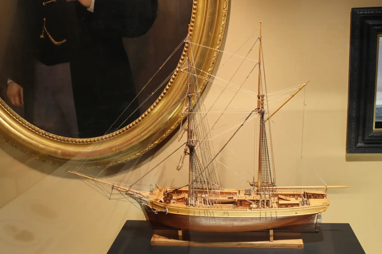 Классическая шебека. Причем интересно, что модели в музее в основном некрашеные, теплого цвета натуральной древесины. При этом в пушечных портах пушек нет, поскольку они металлические и выбивались бы из общего стиля!