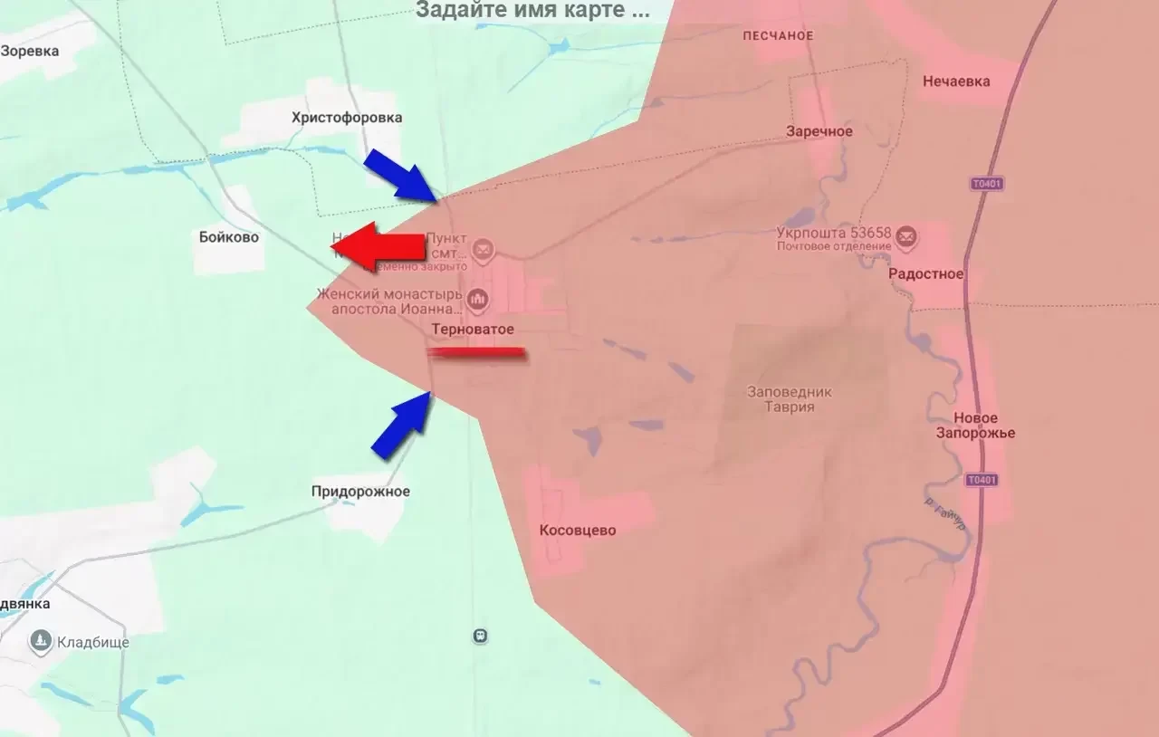 В сообщениях с этого участка фронта говорится о том, противник, используя бронетехнику, старается высадить десант со стороны населённых пунктов Христофоровка и Придорожное. Это в направлении Терноватого. Одновременно с этим силы противника маневрируют южнее – в районе Зализничного (Железнодорожного), что к западу от Гуляйполя. Противник сознательно активизировался сразу на двух участках, чтобы попытаться раздёргать наши войска и добиться как минимум возвращения под контроль Терноватовских высот – ключевых на этом направлении.
