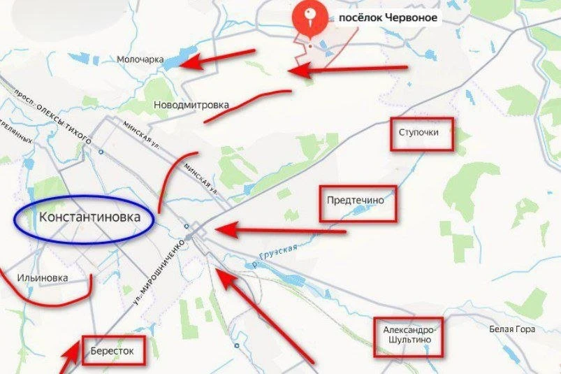 С мест сообщают о занятии новых позиций в районе Новодмитровки и Червоного. К северу от Часов Яра продвинулись от Новомарково в сторону Тихоновки. Также есть успехи в районе Миньковки и Голубовки.