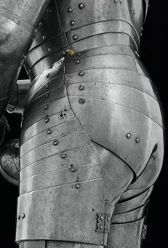 Так появился второй комплект доспехов, и тоже для пешего поединка. Собрали его как конструктор из уже готовых деталей, вероятно, выполненных разными мастерами в разное время. Но вот украсили его уже в едином стиле, чтобы никто ничего «такого» не подумал! В отличие от предыдущего доспеха, этот доспех имел «юбку» (тонлет) в форме колокола, из металлических полос, приклепанных к кожаной основе. Такая конструкция позволяла уменьшить вес доспеха и трудоемкость его изготовления за счет отказа от защитных деталей для ног выше коленей. Щитки на внешней стороне наколенников («раковины») в данном случае имели вид бантов на модных в то время подвязках.