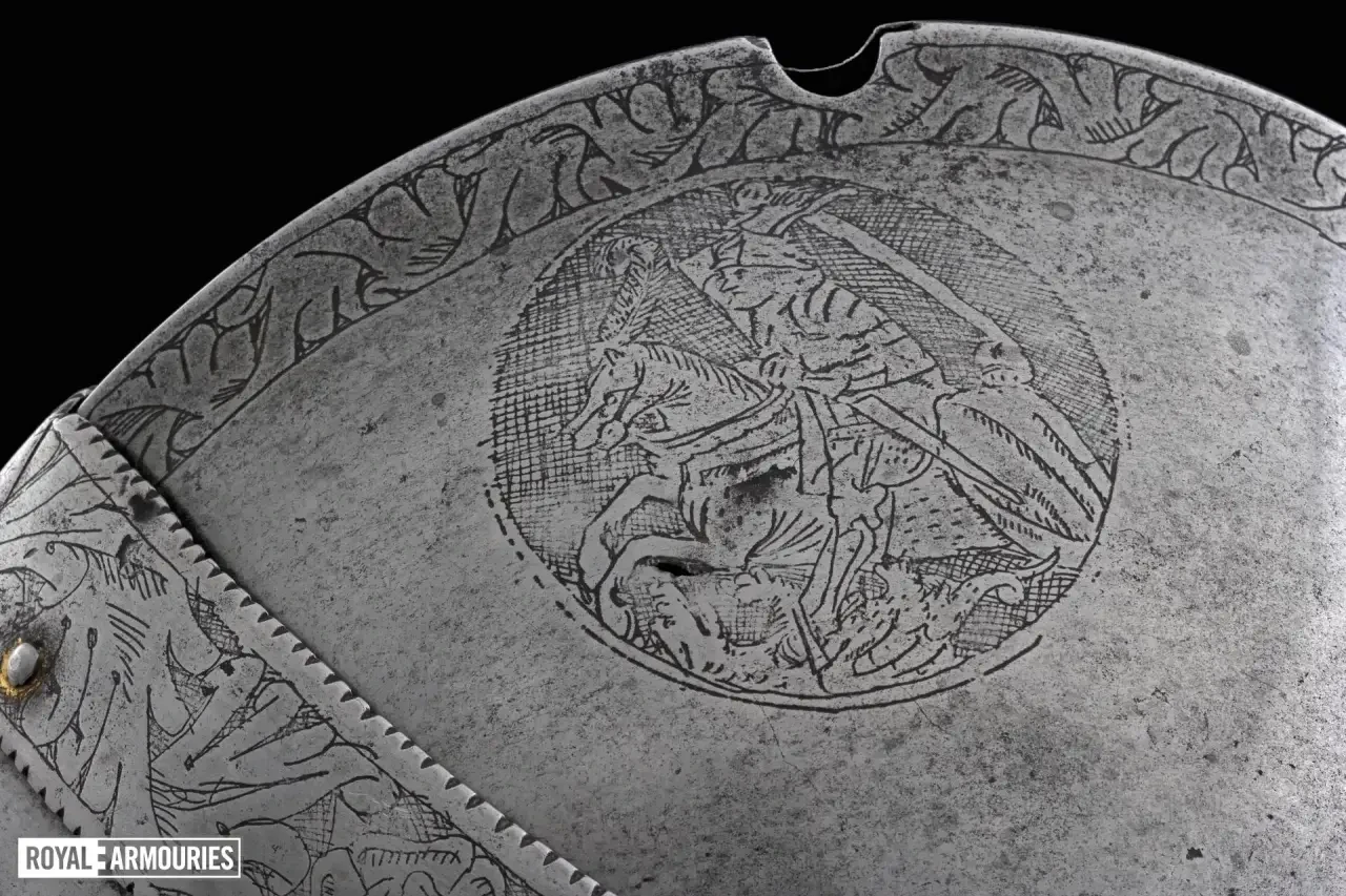 Наплечники из перекрывающих друг друга пластин стали отличительной особенностью мастерской в Гринвиче. Левый (если смотреть спереди) наплечник состоял из восьми полос, а вот правый почему-то из семи. Юбка состоит из девяти полос, как спереди, так и сзади. Петли на ней находятся слева, пряжки ремней справа. Латы для ног могли быть изготовлены в Италии или во Фландрии. Их попросту взяли от какого-то старого доспеха.