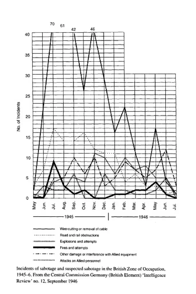 Результаты деятельности «Вервольфа» в британской зоне оккупации Германии, май 1945 - июль 1946 гг. (сверху вниз):
