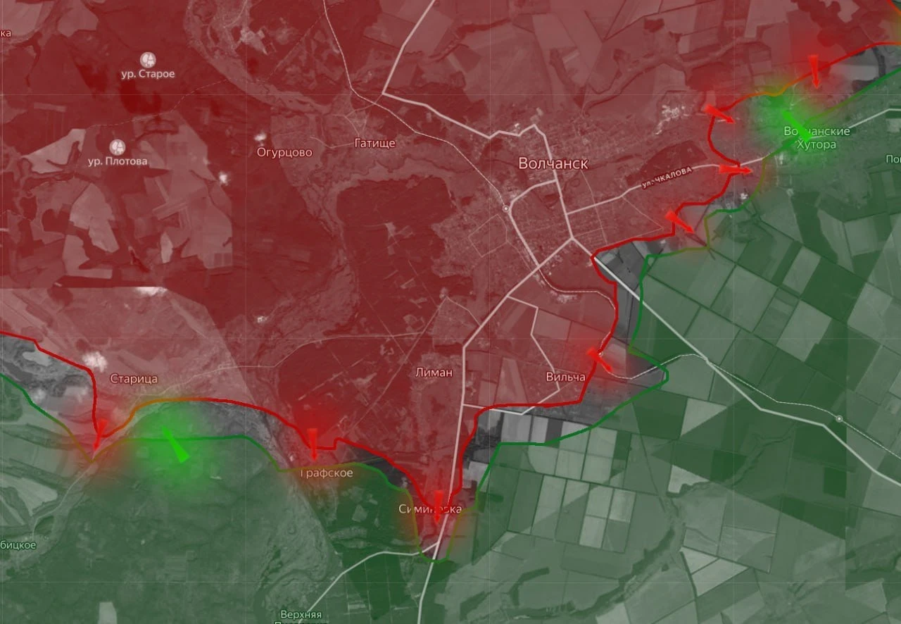 Российские войска продолжают наступление в населенных пунктах и лесополосах около Волчанска. В лесу возле Старицы они продвинулись на трех участках примерно на 300 метров. В Волчанских Хуторах штурмовики заняли более 10 домов, продвинувшись на восток более чем на 300 метров.