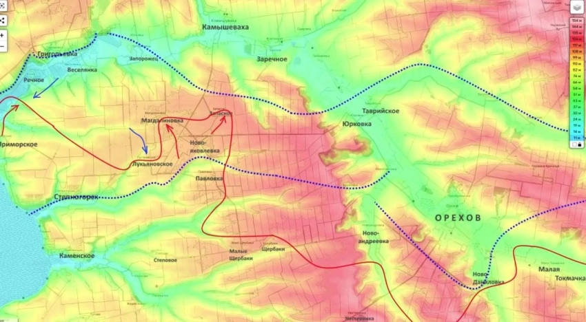 По его словам, штурмовые подразделения стараются сейчас дочистить эти сёла, чтобы полностью их занять, после чего планируется дальнейшее развитие наступления в направлении Юрковки и Камышевахи. Речь идёт о двух основных векторах: продвижении в сторону Запорожья и обходе Орехова с северо-запада.