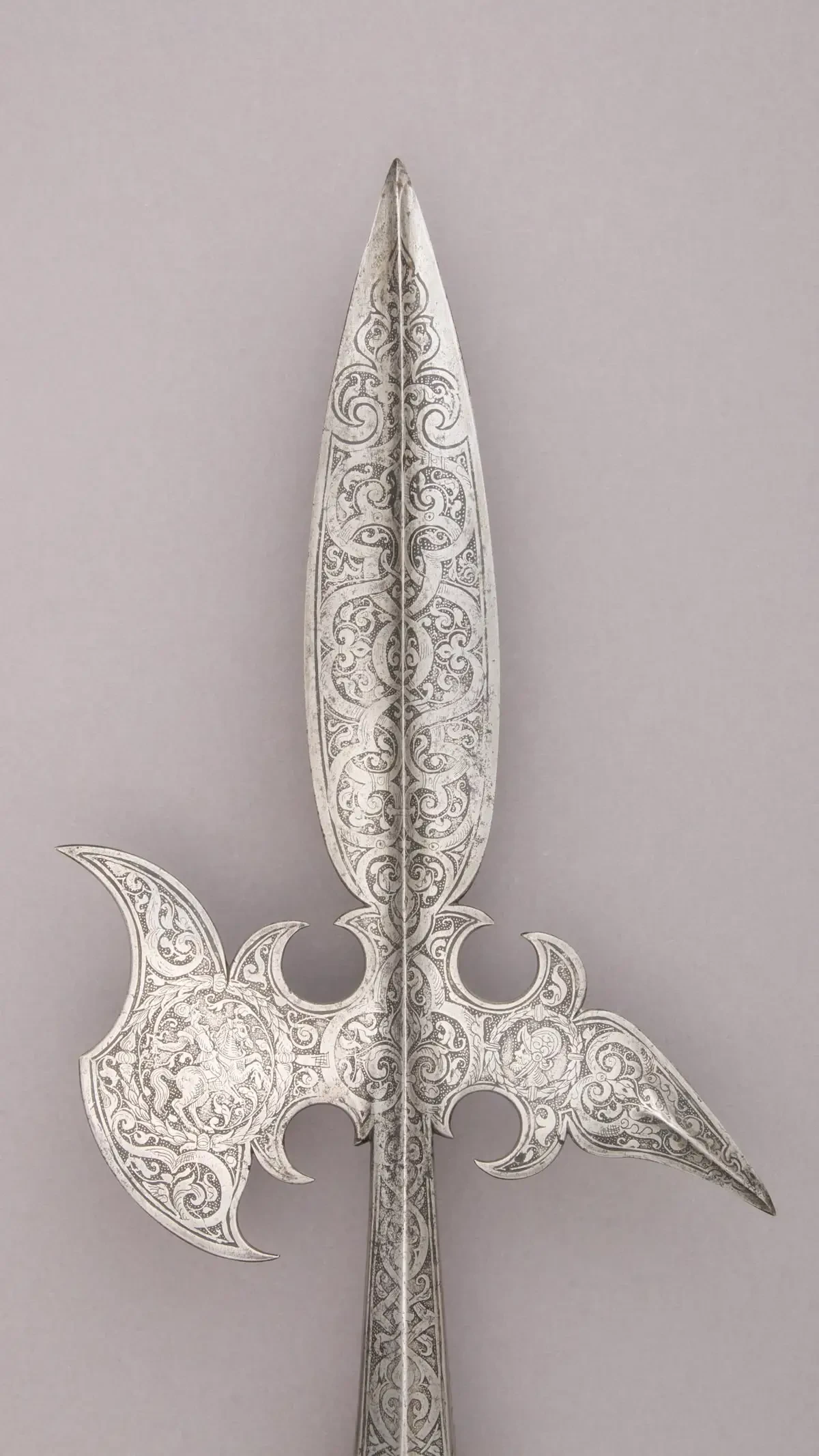 Итальянская алебарда, ок. 1560. Материал: сталь, дерево, золото. Длина 266,9 см. Длина головки 80 см. Ширина 39,3 см. Вес 2830 г. Метрополитен-музей, Нью-Йорк