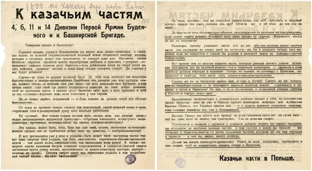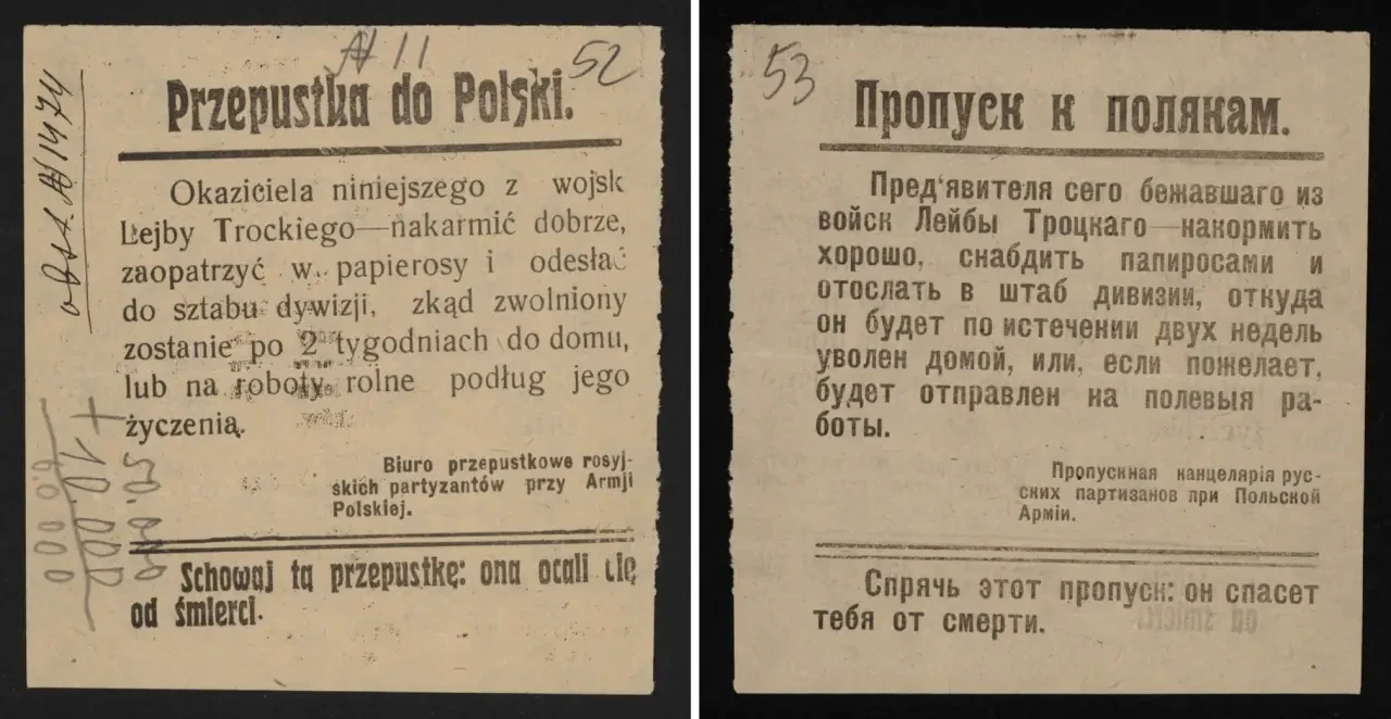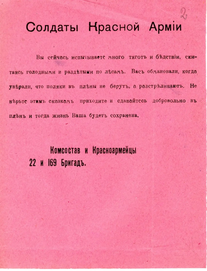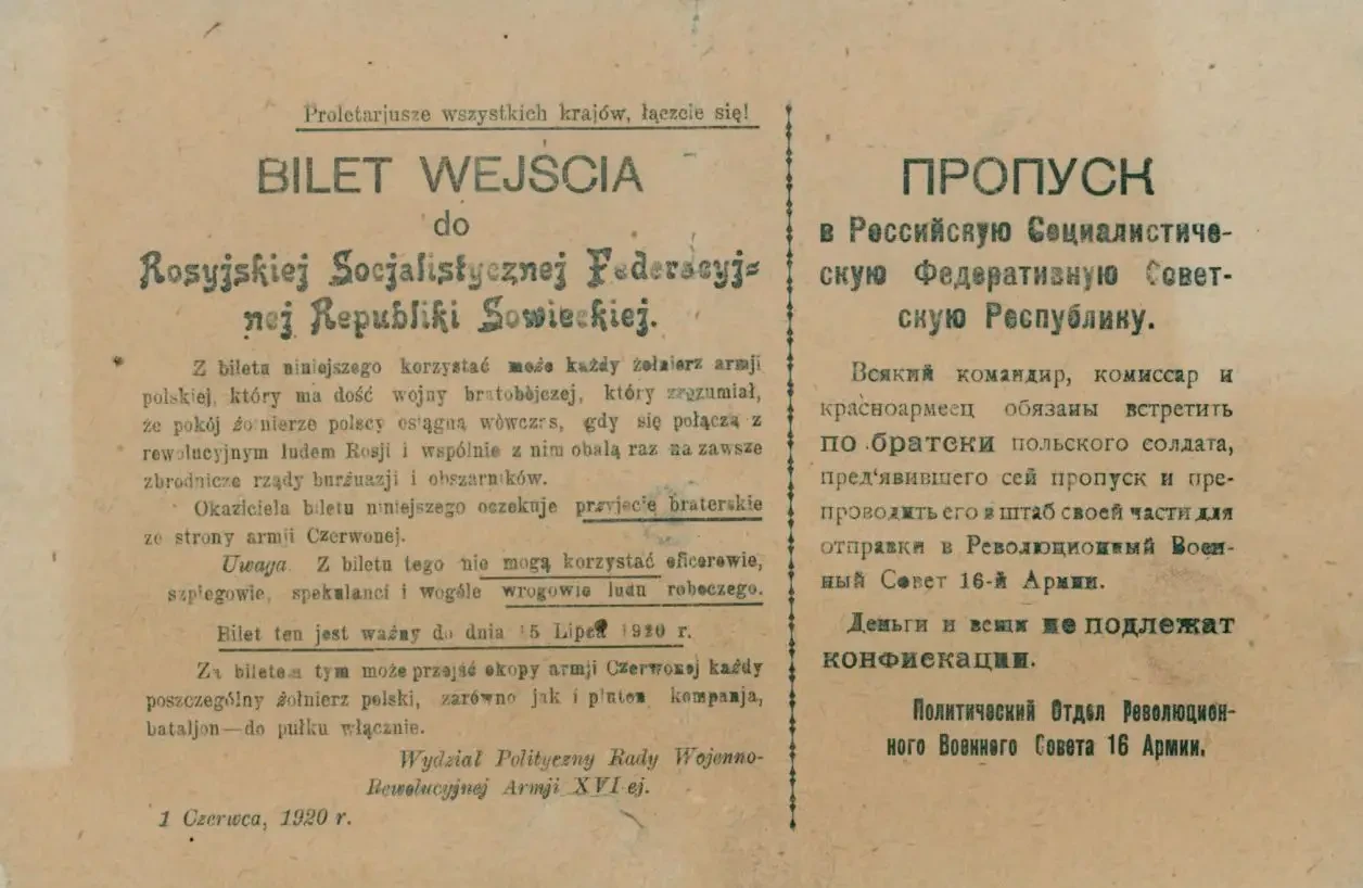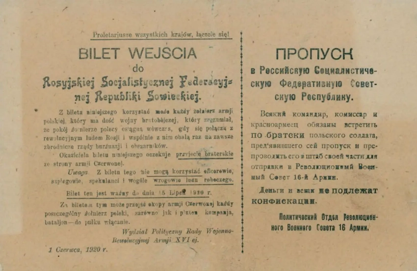 Листовка-пропуск с обращением к польским солдатам. Данный вид агитации использовался советскими войсками уже в 1919 году. Архив РГАСПИ: Ф. 104. Оп. 1. Д. 18. Л. 22–22.