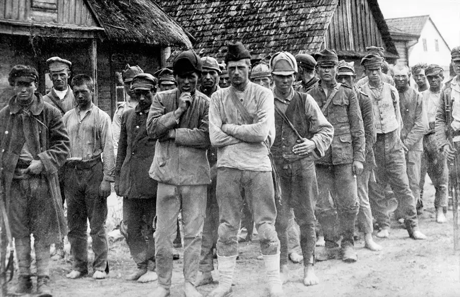 Группа военнопленных, в том числе из 5-й Польской дивизии, под конвоем красноармейцев в одном из населенных пунктов. Архив РГАКФД: № 0-230399.