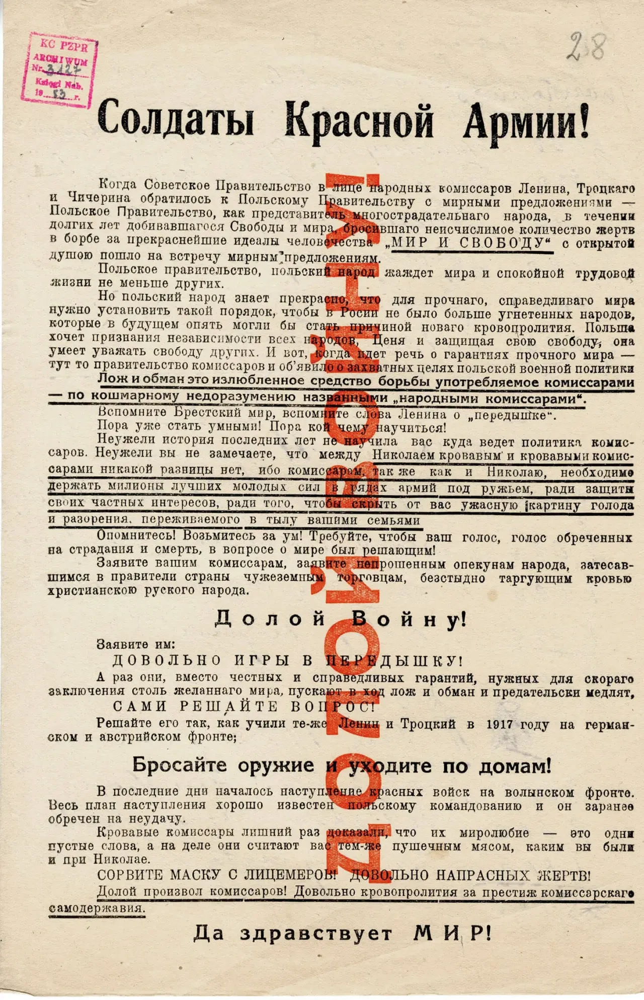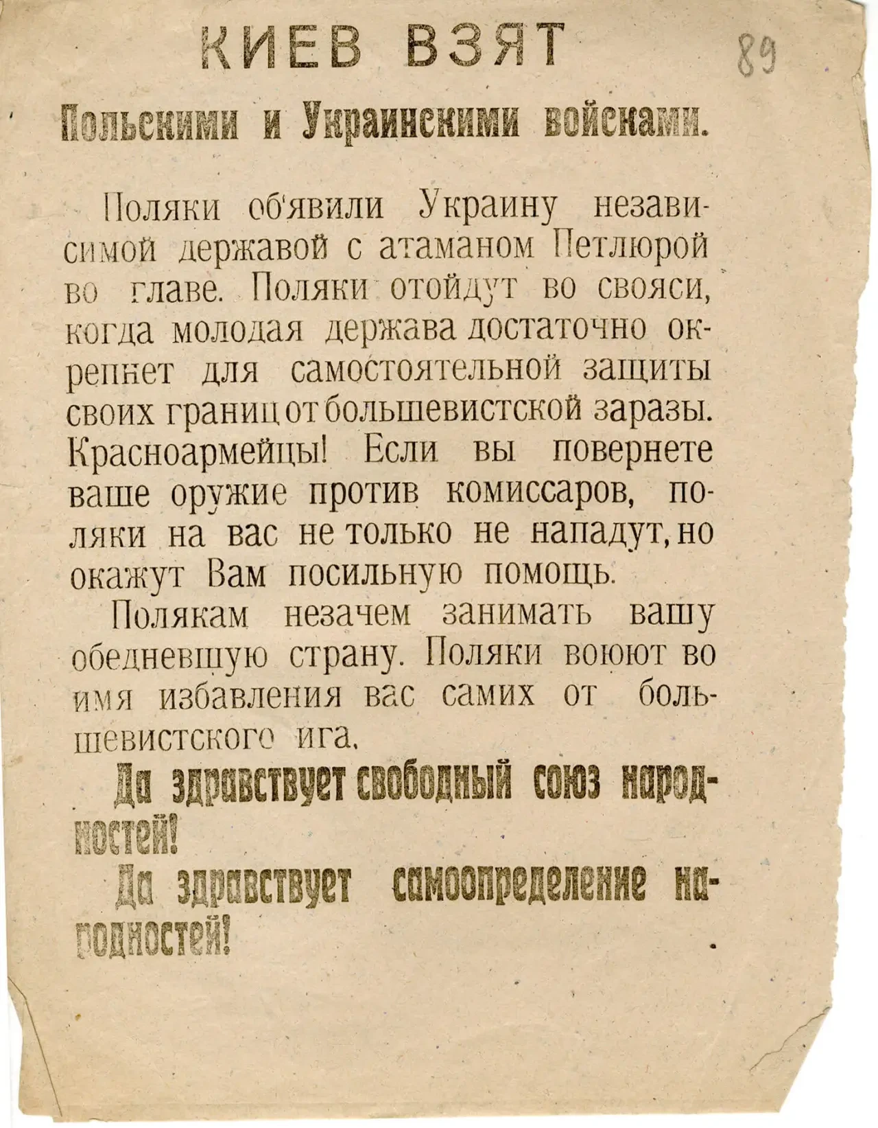 Листовка РВС 12-й армии с обращением к польским солдатам прекратить братоубийственную войну и выдержками из обращения СНК РСФСР к польскому правительству и народу. Архив РГАСПИ: КП-104049 ПМ-3419.