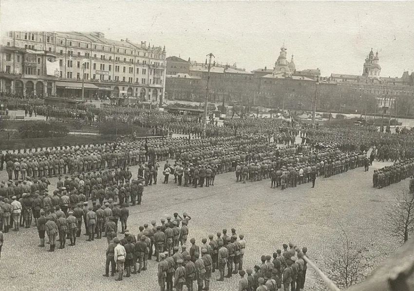 Части Красной армии на Театральной площади перед отправкой на Польский фронт. Архив РГАКФД: Ф. 788. Оп. 1. Д. 704. Л. 1.