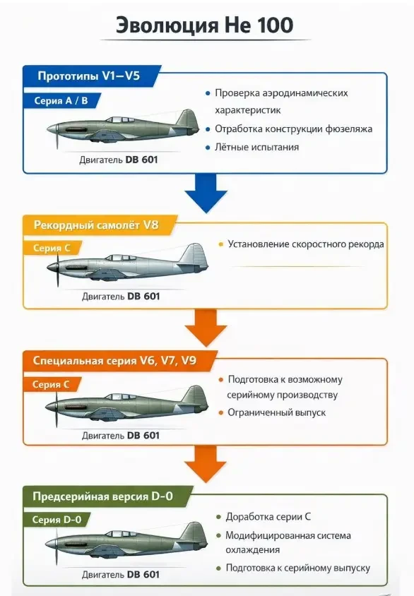 Серия прототипов He.100 состояла из 10 машин (от V1 до V10), каждая из которых имела свои особенности и задачи.