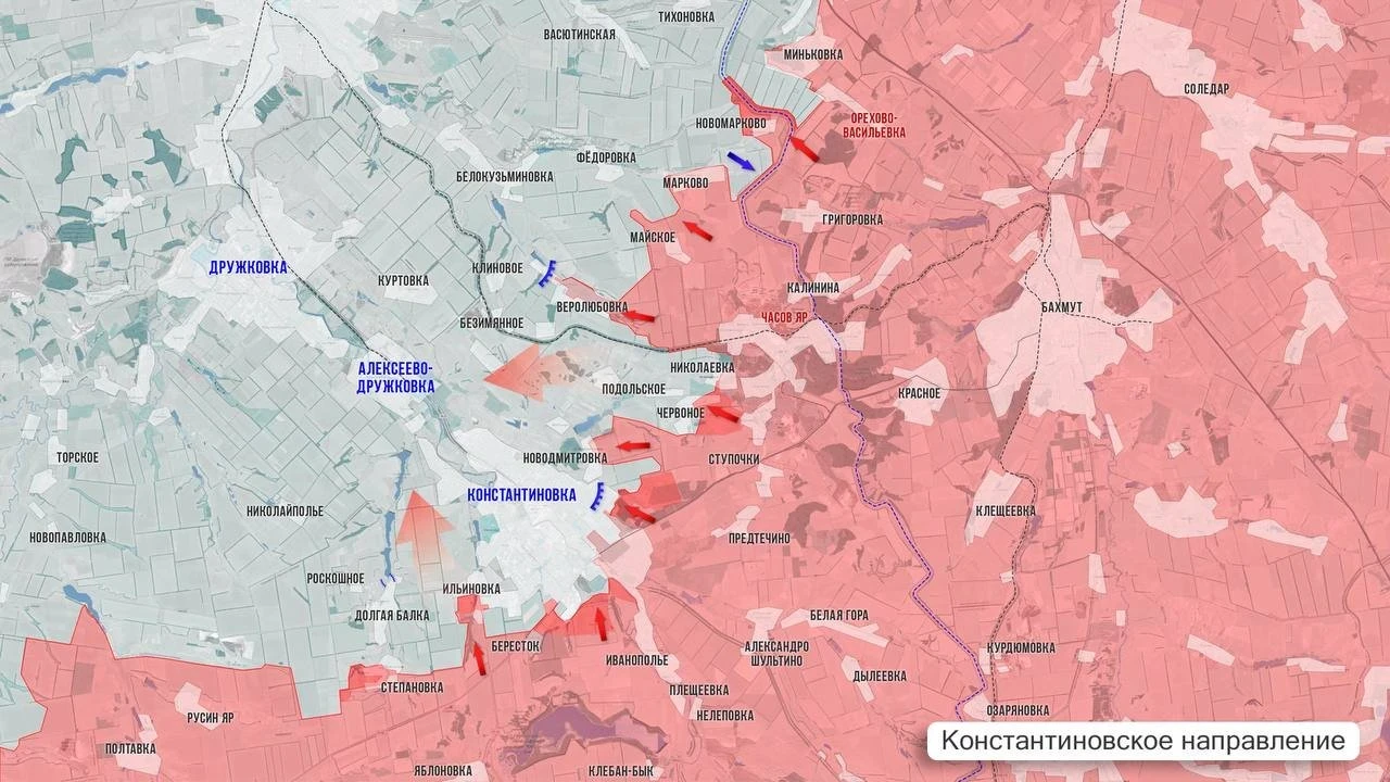 Российская армия завершила подготовку к генеральному штурму Константиновки. Уничтожение дамбы Хрущевского пруда отрезало местный гарнизон от основных путей подвоза БК и провизии. В юго-западной части города продолжаются бои на территории стадиона «Металлург» и вдоль железной дороги, где наши бойцы пытаются рассечь оборону ВСУ.