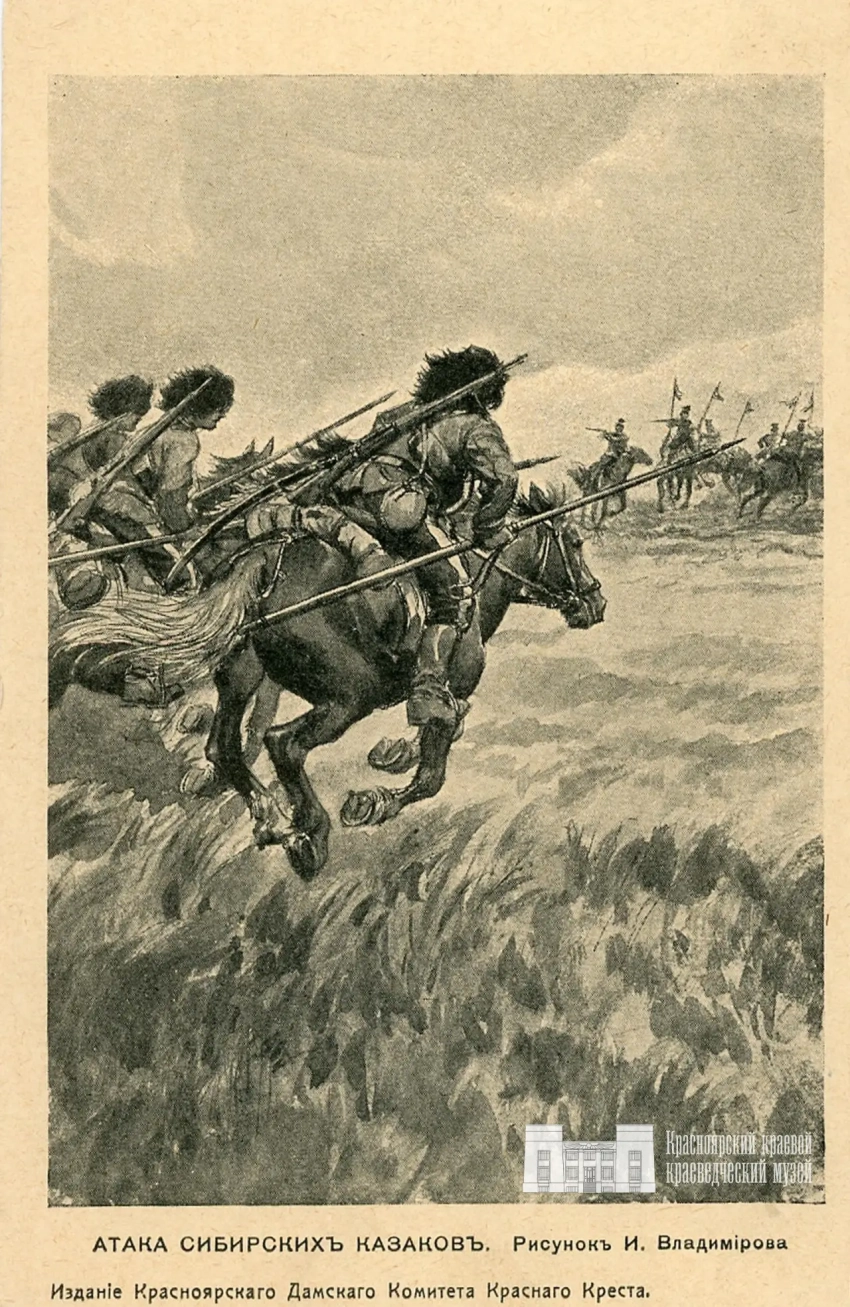 Открытка из фондов КККМ. Владимиров И. Атака сибирских казаков. 1914 г.