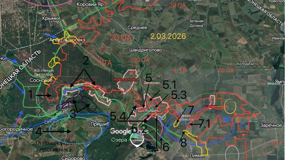 На севере участка сохраняется контроль над окраинами Святогорска, а в Яровой, имеющей статус важного логистического хаба, уже водружен российский флаг. Передовые разведгруппы форсировали водные преграды и зашли в районы Пришиба и Татьяновки, расширяя зону операций вдоль Северского Донца.