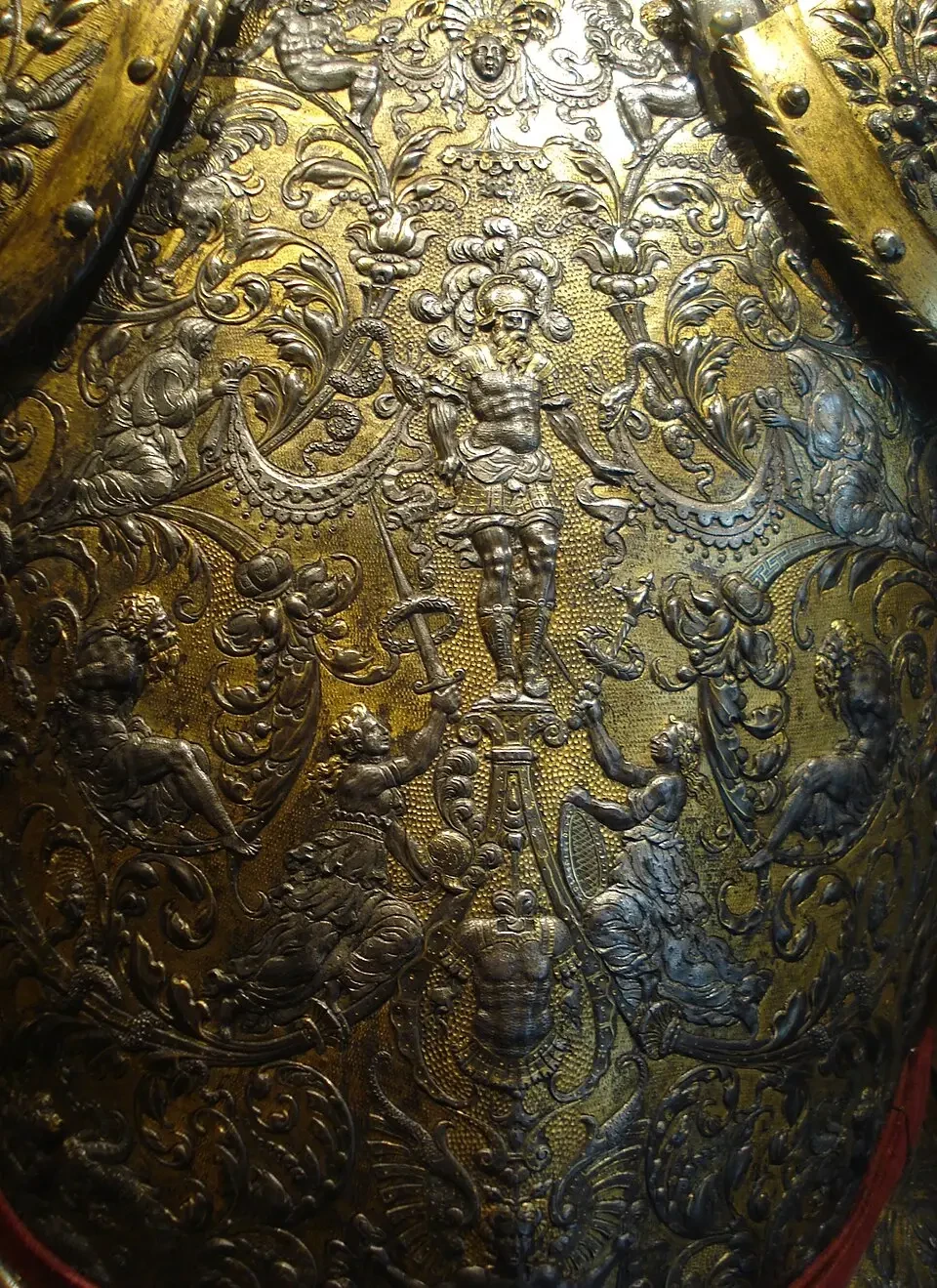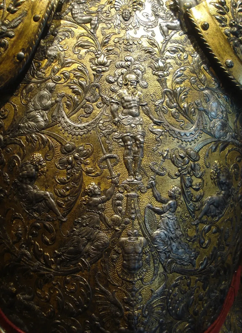 Понятно, что это не боевой, а парадный доспех, которые, предположительно, датируются 1553–1555 годами. И роскошь его неудивительна, поскольку авторство приписывается известному французскому ювелиру и граверу Этьену Делону. Доспех, предназначенный для торжественных церемоний, был изготовлен из стали, золота и серебра, а также украшен тисненой кожей и красным бархатом. Ну а многочисленные фигуры, выгравированные на поверхности этого доспеха, на его нагруднике и на спине, символизируют его военные успехи.
