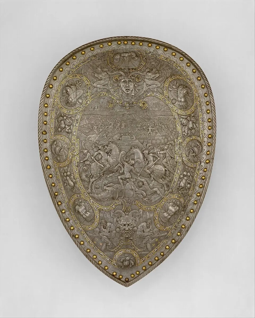 Хотя щиты в это время рыцарям уже не требовались, их все равно делали «красоты ради» в комплект к парадным доспехам. Один из таких щитов Генриха II на котором изображена сцена сражения европейских всадников в античных доспехах с турками есть и в коллекции Метрополитен-музея в Нью-Йорке