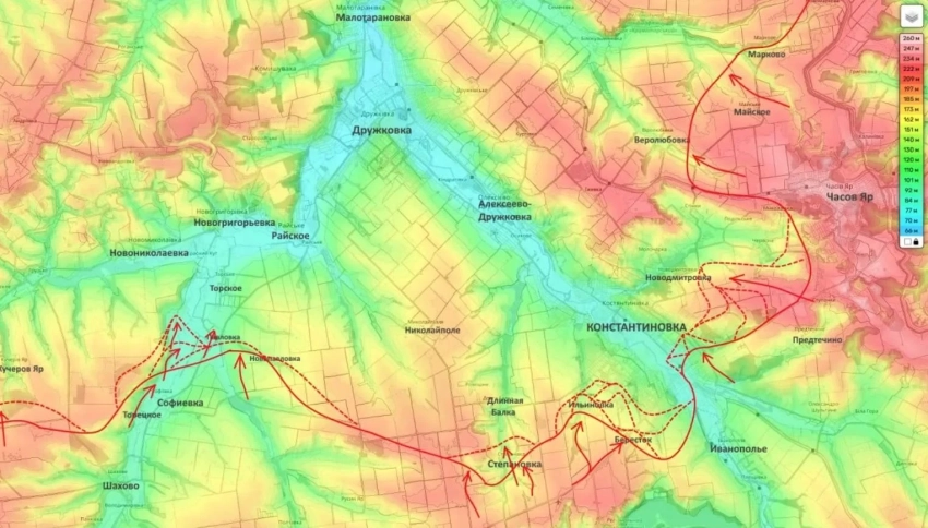 Параллельно развивается успех в Константиновке. ВС РФ продавливают оборону противника на северо-востоке города (со стороны Ильиновки) и в высотной застройке на юго-западе.