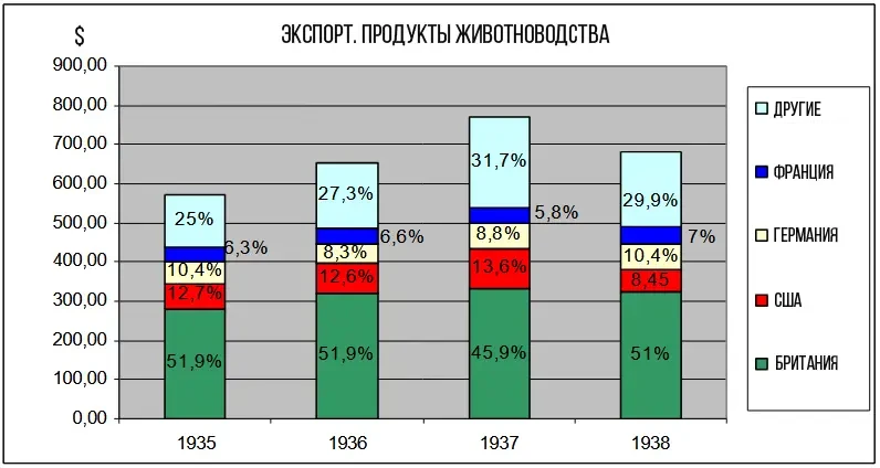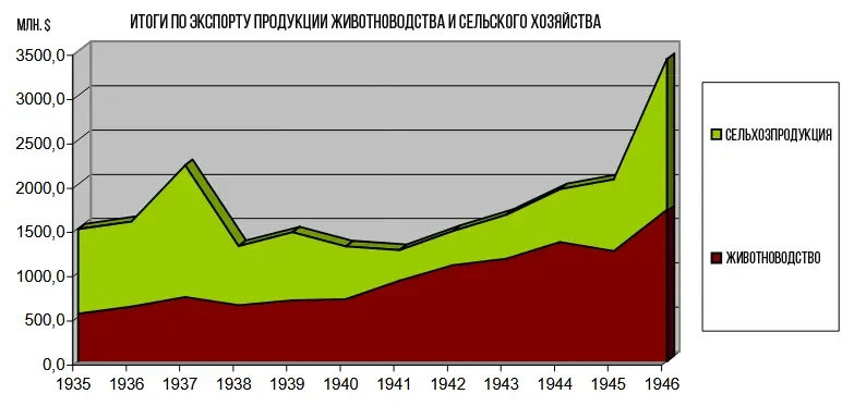 Довоенный экспорт аргентинской продукции животноводства. До Второй мировой войны Аргентина была крупным мировым экспортером продукции животноводства, особенно говядины. Это доминирование было обусловлено природными ресурсами Аргентины, включая обширные пастбища и развитием холодильных технологий, позволявших экспортировать свежую и охлажденную говядину, в отличие от более ранних периодов, когда рентабельной была только соленая говядина. Именно в этот период Аргентина пережила значительный экономический бум, обусловленный экспортом сельскохозяйственной продукции, включая продукцию животноводства, что еще больше укрепило ее позиции в качестве важного торгового партнера...