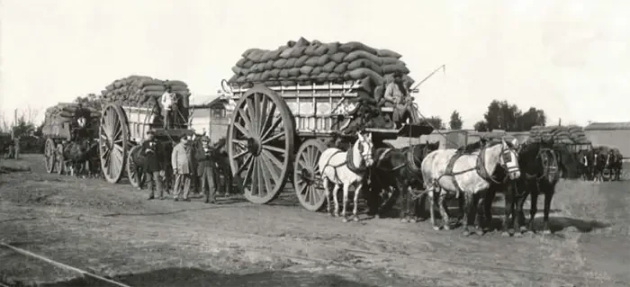 Аргентинское зерно, отправляемое в Италию. В 1920-х и 1930-х годах Аргентина была крупным экспортером зерна, в том числе пшеницы, в различные европейские страны. Мировая экономическая депрессия 1930-х годов хотя и повлияла негативно на экспорт зерна из Аргентины, но страна по-прежнему продолжала играть важную роль на мировом рынке сельхозпродукции.
