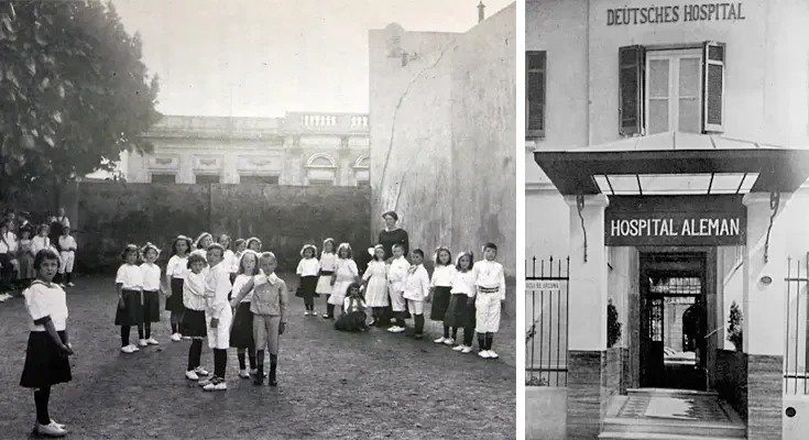 В 30-х и 40-х годах в Аргентине проживала крупная и разнообразная немецкоязычная община, насчитывавшая, по некоторым оценкам, около 300 000 человек. В состав этой общины входили как иммигранты XX века, так и более поздние иммигранты, и она охватывала различные политические, социальные и религиозные группы. Некоторые ее члены активно поддерживали нацистскую Германию, другие же были ярыми антинацистами и сформировали в стране значительное антифашистское движение. Хотя Аргентина и приветствовала приток многих немецких иммигрантов, в том числе и еврейских беженцев, приток нацистских агентов и распространение нацистской идеологии также вызывали беспокойство и тревогу, особенно со стороны Соединенных Штатов. На фото слева: внутренний двор немецкой общеобразовательной школы. На фото справа: немецкая больница, в городском районе Реколета (Recoleta). Немецкоязычные рабочие, ежемесячно платили членские взносы в Немецкую больничную ассоциацию