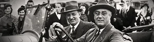 Министр финансов США Генри Моргентау-младший (слева) и президент США Франклин Рузвельт. Генри Моргентау-младший сыграл важную роль в разработке и финансировании рузвельтовского Нового курса. В 1938 году, понимая, что система иммиграционных квот США недостаточна для размещения всего числа иммигрантов, желавших приехать в США, он предложил Рузвельту приобрести Британскую и Французскую Гвиану, чтобы использовать эти территории в качестве убежища для иммигрантов из нацистской Германии, но получил отказ...