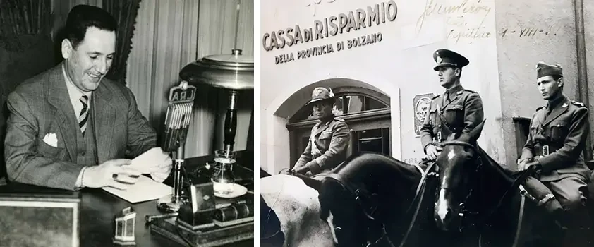 На фото слева: Хуан Доминго Перон де ла Соса выступает по национальной радиостанции Аргентины - LRA. На фото справа: До начала Второй мировой войны, в начале 1939 года, Перон был отправлен в Италию, чтобы следовать учебным курсам по различным дисциплинам, где он и познакомился с фашизмом Муссолини, который позже сыграет важную роль в некоторых его политиках в Аргентине. По прибытии из Италии в Аргентину Перон был убежден, что фашизм является лучшей системой правления для сбалансирования отношения между капиталом и трудом. По словам Перона, Германия и Италия вовсе не были агрессорами в европейском конфликте, они просто защищали свои идеи против капиталистических американцев и коммунистических Советов. Во время своего пребывания в Италии Перон также посетил Германию, Францию, Испанию, Венгрию, Югославию, Албанию и Советский Союз...