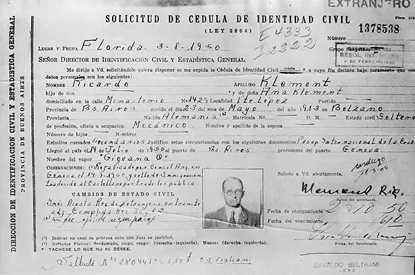 Аргентинское удостоверение личности нацистского военного преступника Адольфа Эйхмана, выданное на имя Рикордо Климента