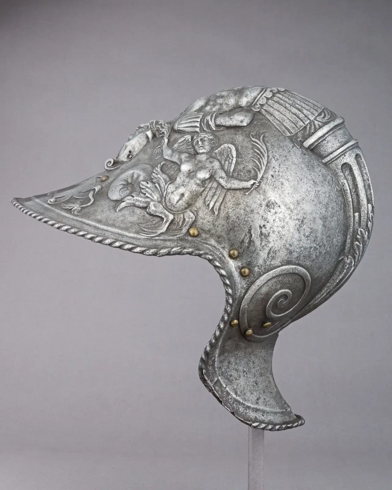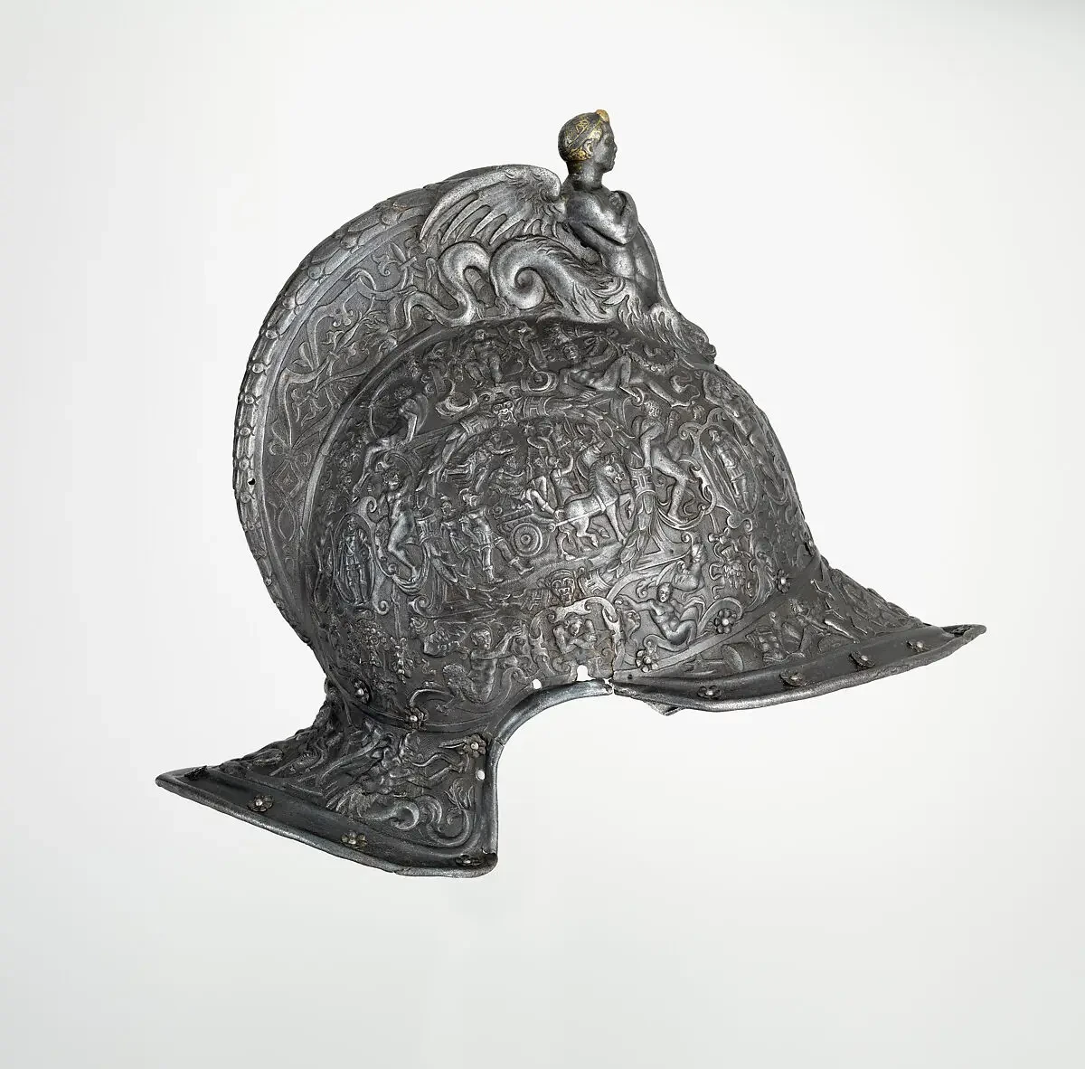 Бургиньот Филиппо Негроли, 1543 г. Высота 24,1 см. Ширина 18,6 см. Диаметр 29,2 см. Вес 1871 г. Метрополитен-музей, Нью-Йорк. Этот шедевр ювелирного искусства эпохи Возрождения украшен подписью Филиппо Негроли на налобнике. Писатели XVI века называли его рельефные доспехи «чудесными» и достойными «бессмертной славы». Чаша шлема, изготовленная из цельного стального листа и патинированная под бронзу, украшена рельефными мотивами, вдохновленными классическим искусством. Изящная сирена, похожая на русалку, образующая гребень шлема, держит за волосы гримасничающую голову горгоны Медузы. Боковые части шлема украшены завитками аканта, на которых изображены путти. Этот мотив восходит к древнеримской скульптуре и настенным росписям