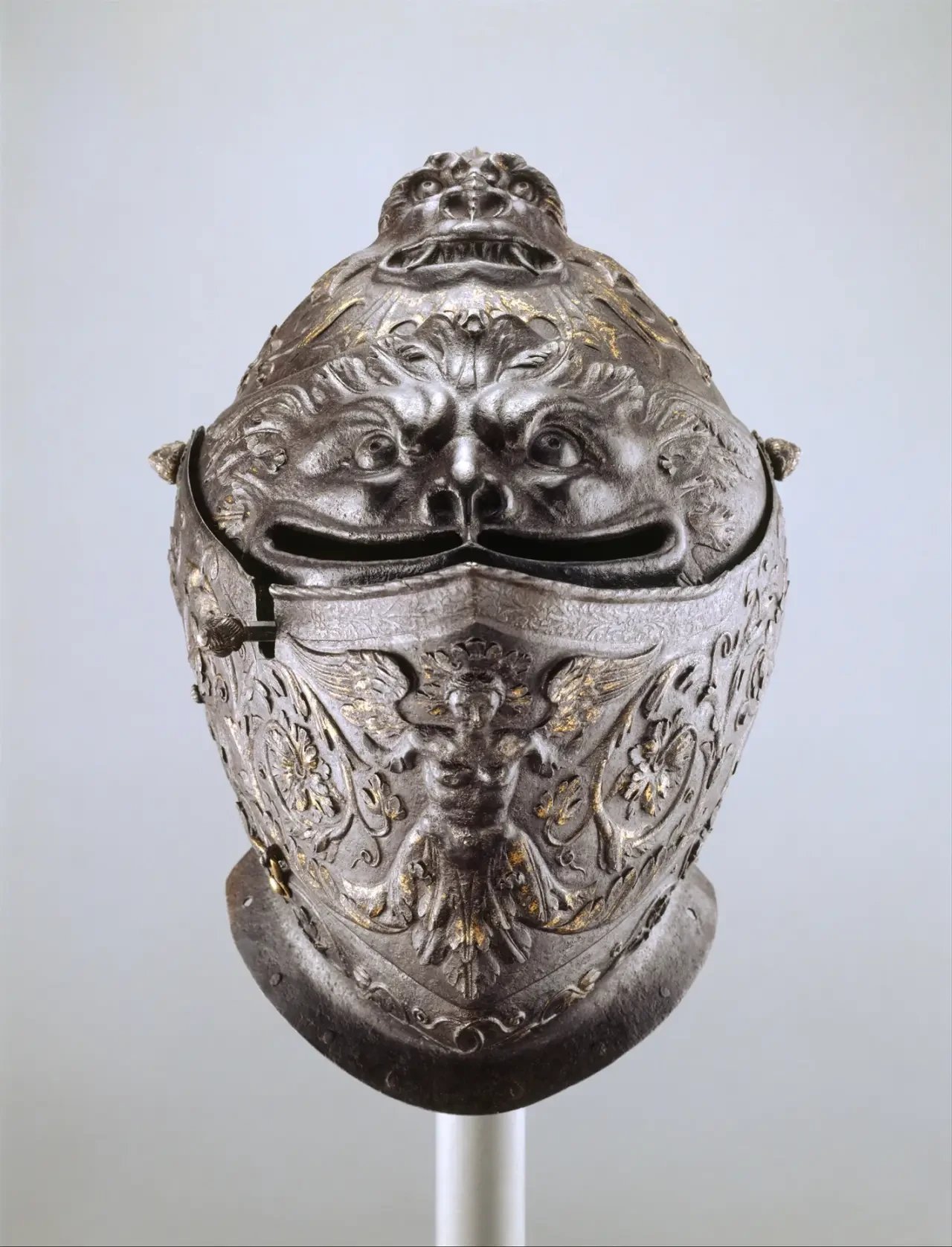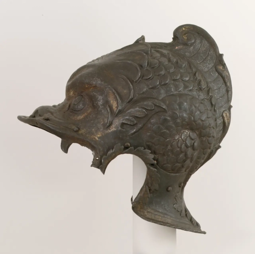 «Закрытый шлем», приписывается Джованни Паоло Негроли,ок. 1540–1545 гг. По дизайну и качеству изготовления этот шлем очень похож на нагрудник из коллекции Метрополитен-музея, подписанный Джованни Паоло Негроли поэтому его можно с уверенностью приписать ему.Материал – сталь. Высота 27,3 см. Ширина 29,2 см. Диаметр 38,1 см); Вес 3068 г. Метрополитен-музей, Нью-Йорк